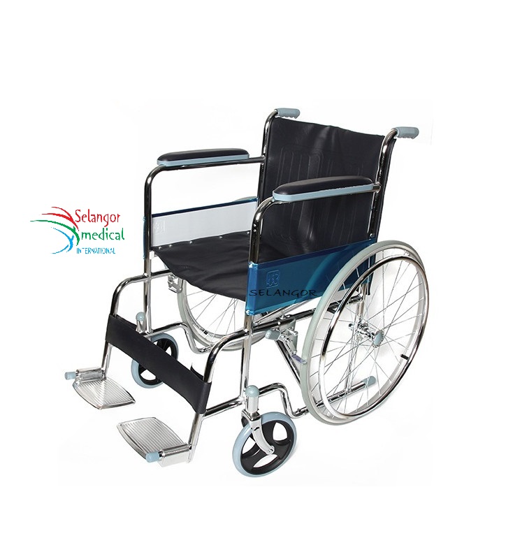 FAUTEUIL ROULANT ADULTE EN ACIER CHROME MARQUE STAR CARE ACCOUDOIR ET REPOSE PIED FIXE. ROUE AVANT 8″, ROUE ARRIÈRE PLEINE 24″ SIÈGE 46 CM
